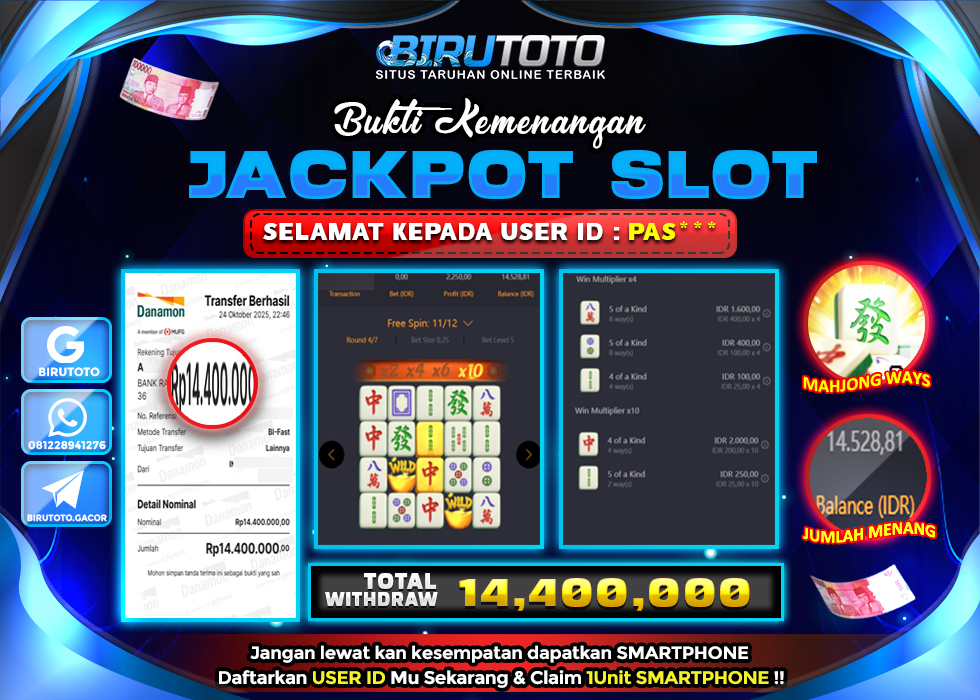 BIRUTOTO JACKPOT SLOT MAHJONG WAYS Rp.14.400.000 LUNAS