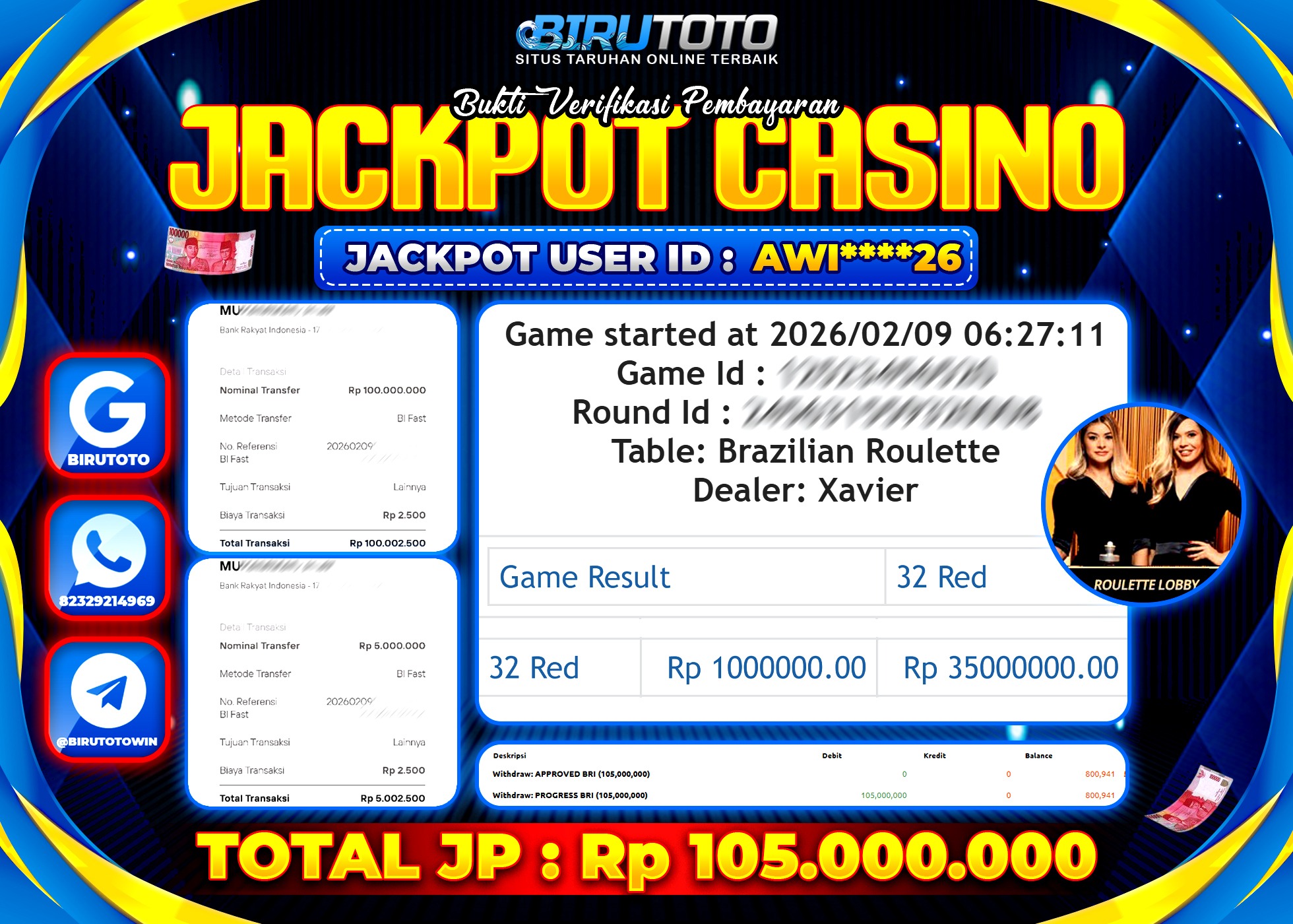 BIRUTOTO JACKPOT LIVE CASINO ROULETTE Rp.105.000.000 LUNAS