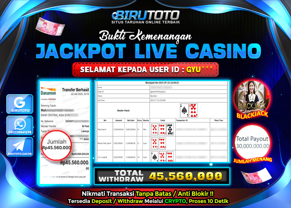 Selamat Kepada Member BIRUTOTO GY**** Telah Jackpot Di LIVE CASINO BLACKJACK
