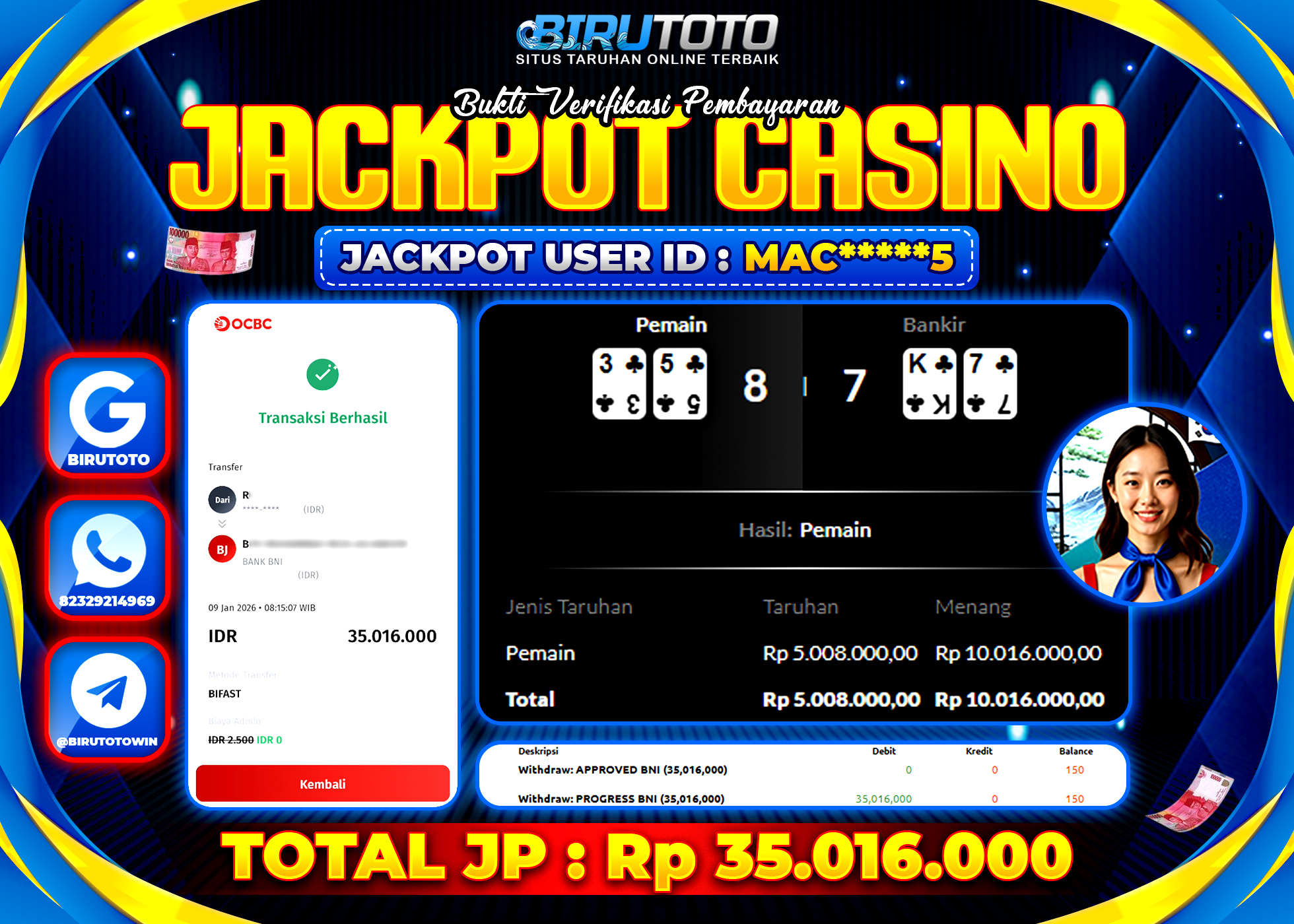 BIRUTOTO JACKPOT LIVE CASINO BACCARAT Rp.35.016.000 LUNAS