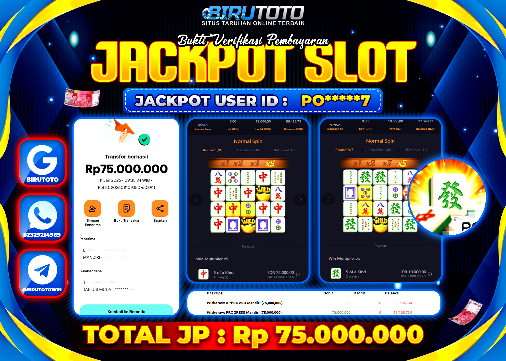 BIRUTOTO JACKPOT SLOT MAHJONG WAYS Rp.75.000.000 LUNAS