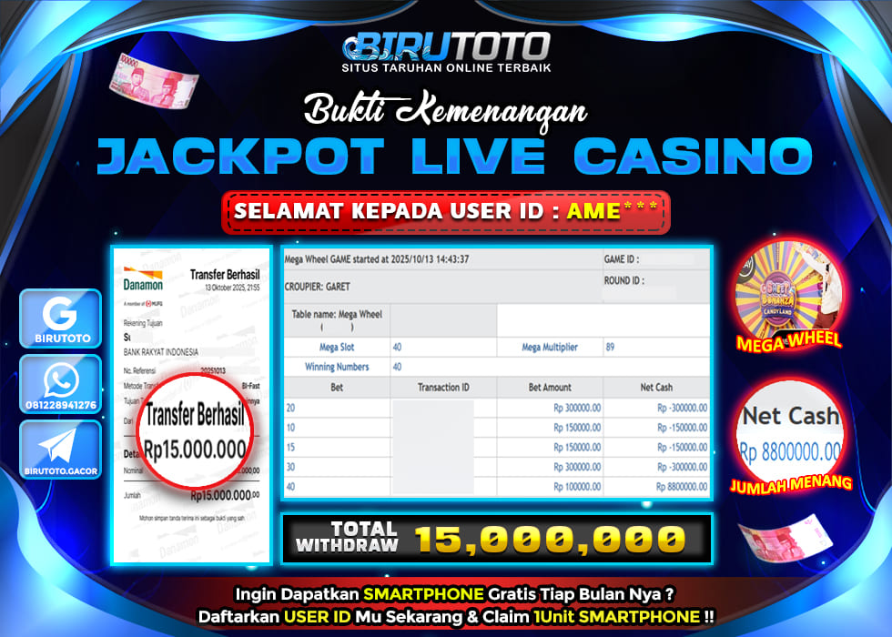 Selamat Kepada Member BIRUTOTO AM**** Telah Jackpot Di LIVE CASINO MEGA WHEEL