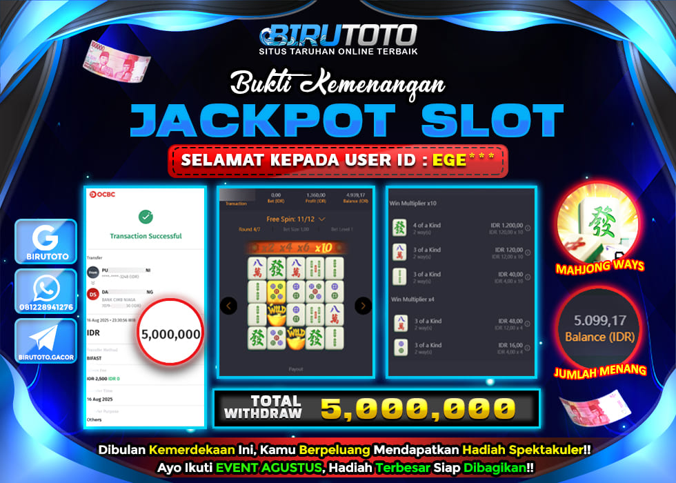 BIRUTOTO JACKPOT SLOT MAHJONG WAYS Rp.5.000.000 LUNAS