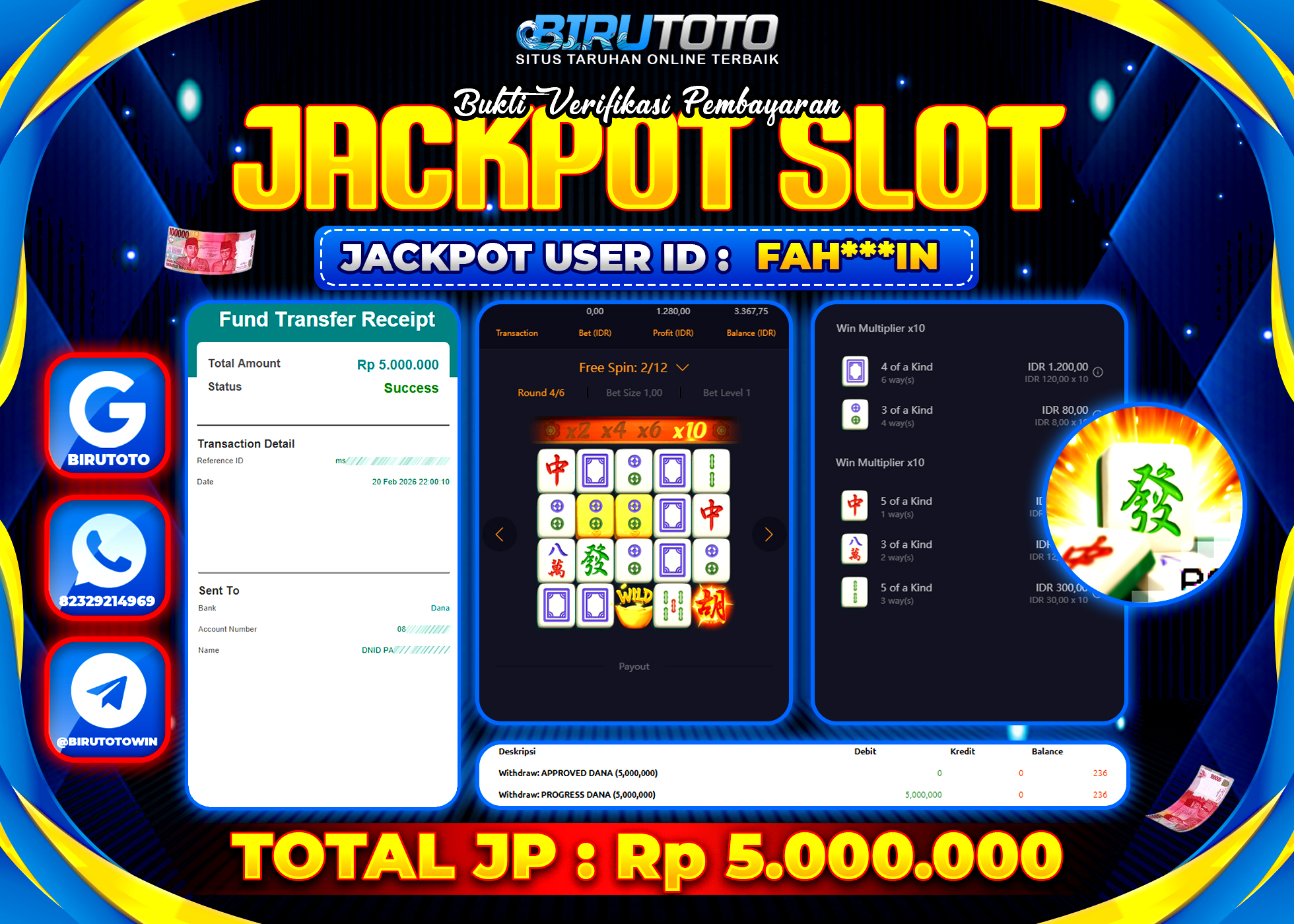 Selamat Kepada Member BIRUTOTO FAH***IN Telah Jackpot Di SLOT MAHJONG WAYS