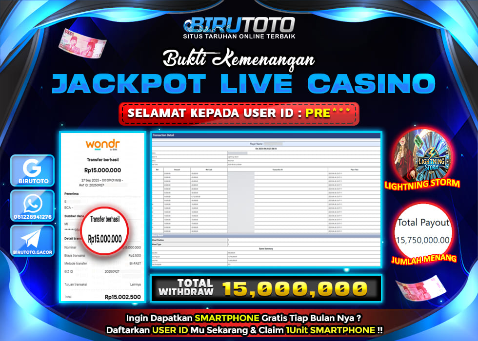 Selamat Kepada Member BIRUTOTO PR**** Telah Jackpot Di LIVE CASINO LIGHTNING STORM